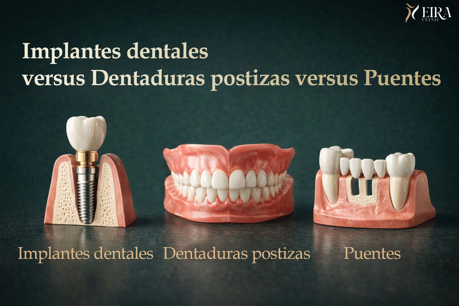 | Aspecto | Implantes dentales | Puentes dentales | Dentaduras |